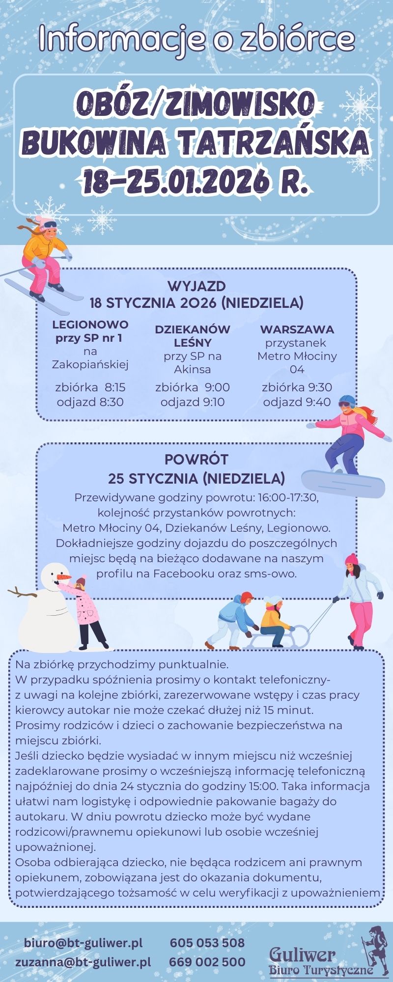 Pomagamy w wynajęciu autokaru dla odpowiedniej liczby pasażerów. Załatwiamy formalności związane z ubezpieczeniem podróżnych. Dbamy o to, aby dzieci wyjeżdżające z pomocą naszego biura na zimowisko dotarły na miejsce o czasie.